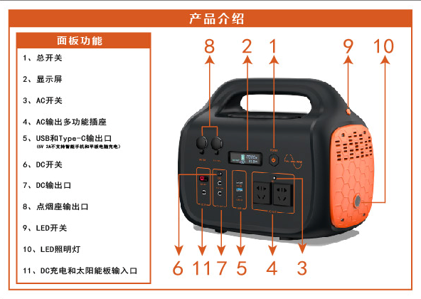 - იგი მხარს უჭერს დატენვას და დატენვას ერთდროულად. მას აქვს გამოყენების ფართო სპექტრი. ის შეიძლება გამოყენებულ იქნას როგორც ონლაინ UPS-ის ელექტრომომარაგება ან როგორც გარე გადაუდებელი სარეზერვო კვების წყარო. მას შეუძლია დააკმაყოფილოს შიდა სამედიცინო აღჭურვილობა, პატარა პრინტერები, სხვადასხვა ნათურები, პატარა თევზის ავზის გამათბობლები, ნოუთბუქები და გარე კემპინგი. იგი გამოიყენება, როდესაც საჭიროა განათება და AC ელექტრომომარაგება ისეთ შემთხვევებში, როგორიცაა ფოტოგრაფია, ხანძარსაწინააღმდეგო, გადაუდებელი სამაშველო და კატასტროფების დახმარება.