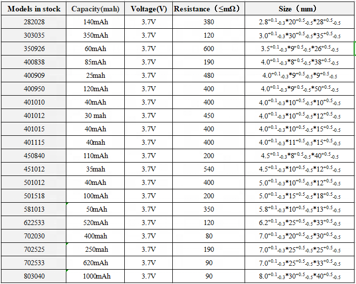 Პროდუქტის სახელი | 581013 3.7V 50mAh პოლიმერული ლითიუმის ბატარეა | შენიშვნა | |