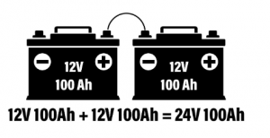 ქვემოთ მოცემულ სურათში ორია 12V ბატარეები უკავშირდება სერიას, რომელიც ამ ბატარეის ბანკს 24V სისტემად აქცევს. თქვენ ასევე ხედავთ, რომ ბანკს კვლავ აქვს საერთო ტევადობის რეიტინგი 100 აჰ.